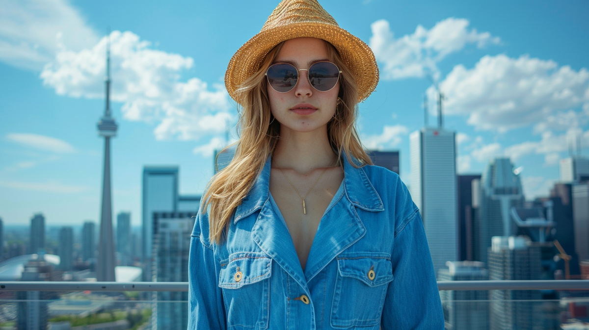 Women's jeans overalls: From workwear to fashion icon, embodying style and comfort. Spring season. White female. CN Tower, Toronto, Canada city background.